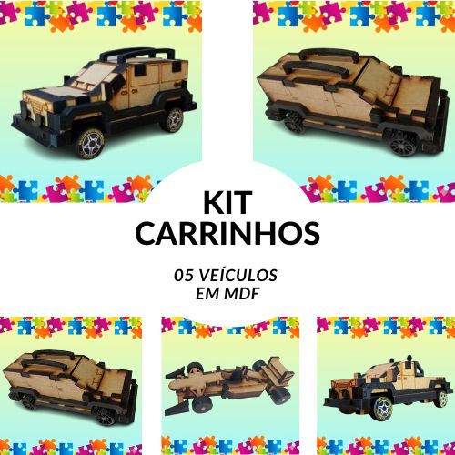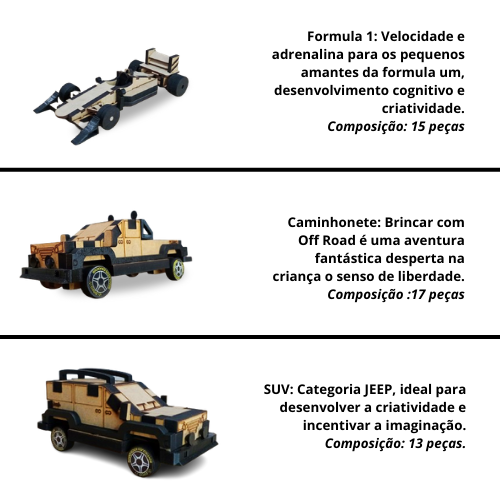 Ao adquirir o Kit Doug Brinquedos, você receberá os seguintes modelos de veículos em MDF, prontos para serem montados: