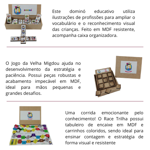 A Migdou Brinquedos reuniu os três jogos mais amados em uma versão premium de madeira sustentável. Este conjunto exclusivo combina o raciocínio do Dominó, a estratégia do Jogo da Velha e a agilidade do Race Trilha. Nós desenvolvemos cada peça em MDF de alta resistência para suportar o uso constante. Assim, garantimos que o aprendizado atravesse gerações com a mesma qualidade e durabilidade de sempre.